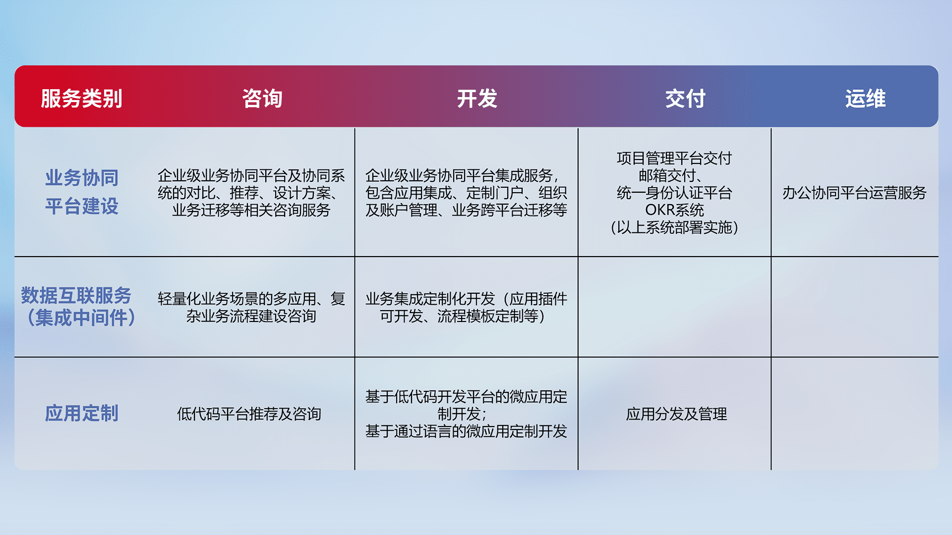 针对钉钉、、企微、、IDaas等平台级产品提供产品的规划、、、方案、、、、交付、、、、定制化开发等服务,,,实现如统一协同办公、、、、智能客户服务、、、、混合会议管理、、、智能数据查询、、等业务场景,,实现数字化转型。。